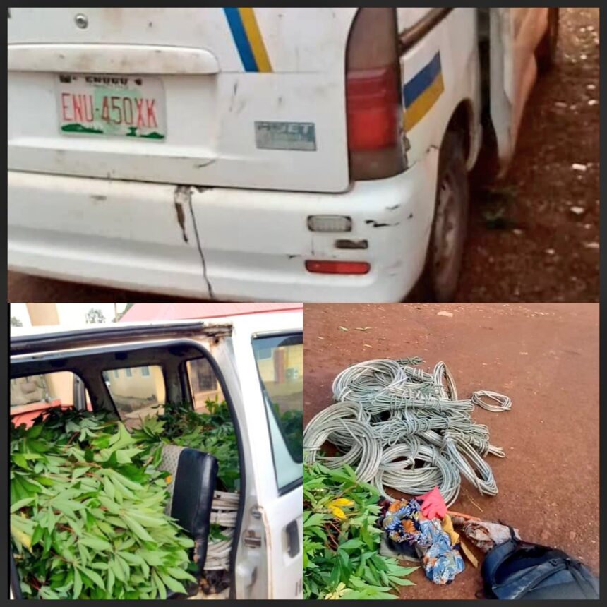 “They recovered lengths of vandalized high-voltage aluminum cables concealed with cassava crop leaves, one big cable cutter, two pairs of rubber gloves, a black bag containing clothes, and the suspects’ operational white-coloured minibus with registration number ENU 450 XK.